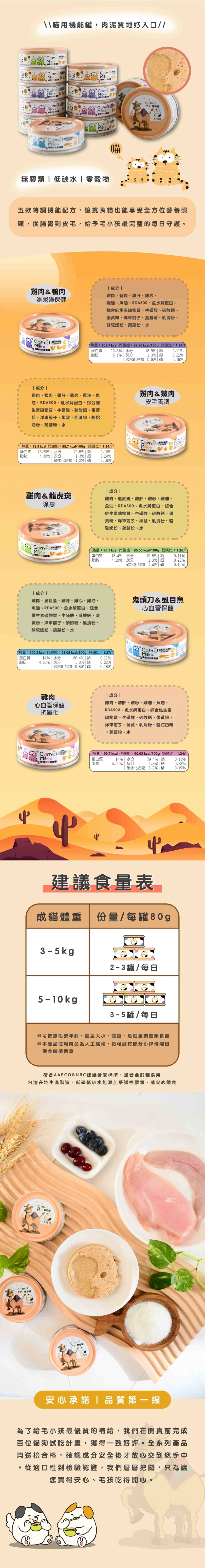 成分:雞肉、虱目魚、雞肝、雞心、雞油、魚油、RDA500、魚水解蛋白、綜合維生素礦物質、牛磺酸、碳酸鈣、蛋黃粉、洋車前子、磷蝦粉、乳清粉、駱駝奶粉、蒟蒻粉、水